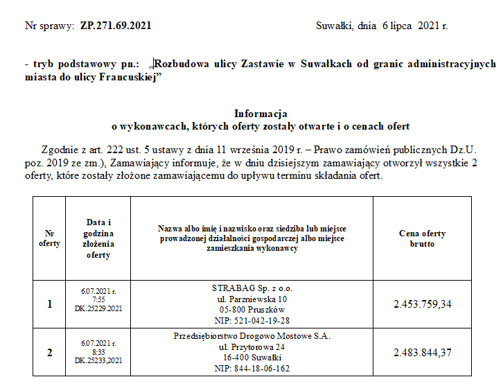 Do ogłoszonego przez Urząd Miejski w Suwałkach przetargu na rozbudowę ulicy Zastawie od granic administracyjnych miasta do ulicy Francuskiej stanęły dwie firmy: STRABAG, który zaoferował wykonanie prac za 2.453.759 zł i PDM Suwałki za 2.483.844 zł brutto.