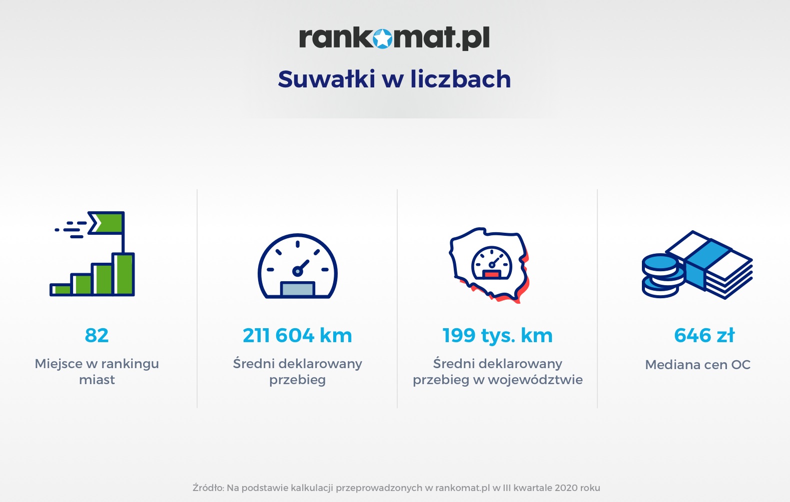 Licznik przeciętnego samochodu należącego do kierowcy z Suwałk pokazuje prawie 212 tys. km. W konsekwencji Suwałki znalazły się na 82. miejscu zestawienia. Za nimi uplasowały się jedynie dwa miasta – Chełm (213 tys. km) i Biała Podlaska (216 tys. km). Z kolei na tle województwa podlaskiego to najgorszy wynik – wyższe pozycje zajęły Łomża (68. miejsce) i Białystok (28. miejsce).