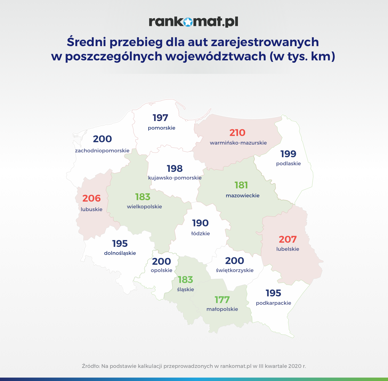 Najlepiej w zestawieniu rankomat.pl wypada Małopolska. Przeciętne auto z województwa małopolskiego przejechało do tej pory 177 tys. km. W województwie mazowieckim ta wartość jest większa o 4 tys. km, a w śląskim i wielkopolskim o 6 tys. km. Największy średni przebieg swoich samochodów deklarują kierowcy z województw lubuskiego (206 tys. km), lubelskiego (207 tys. km) i warmińsko-mazurskiego (210 tys. km). To jednocześnie 3 województwa, w których średni przebieg auta przekracza 200 tys. km.