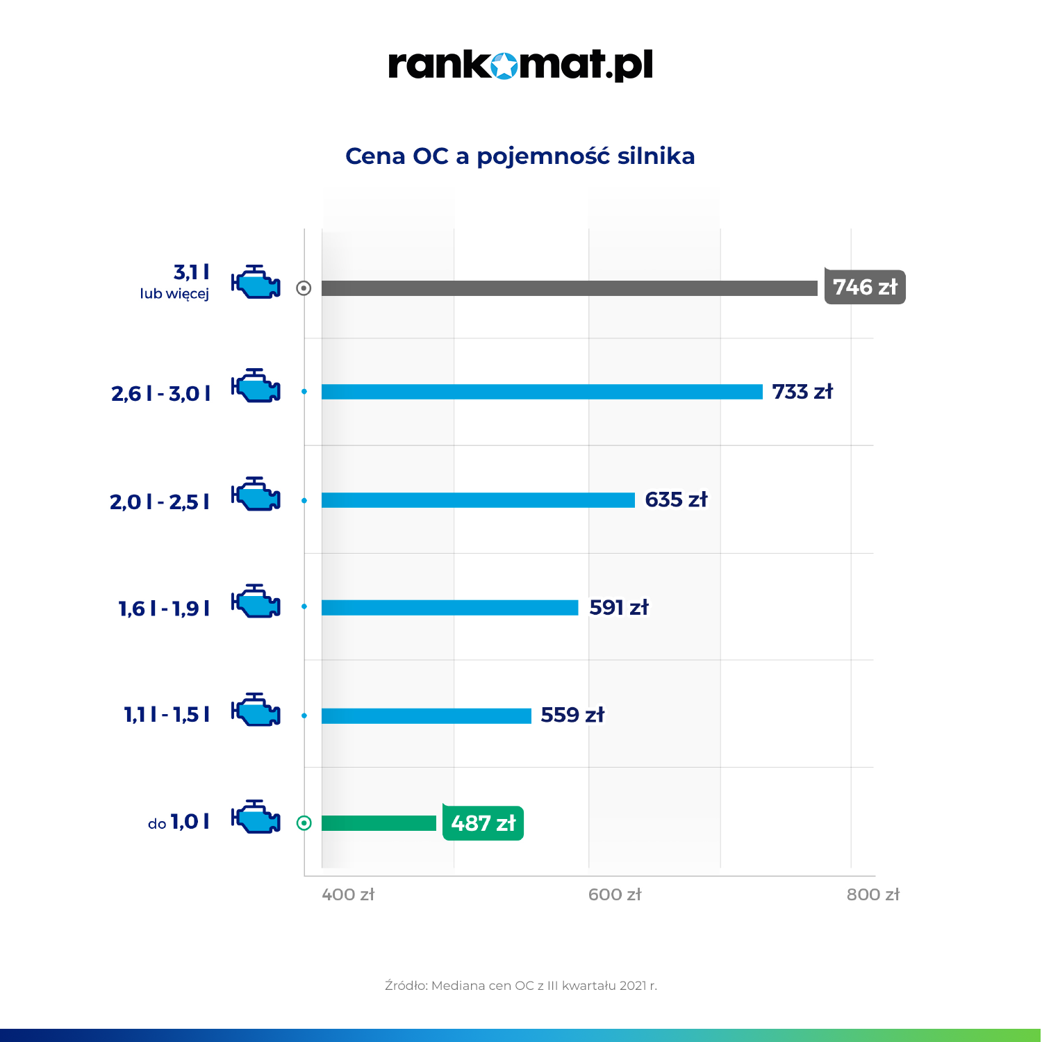 Większość ubezpieczycieli przyjmuje, że duża pojemność silnika ma przełożenie na większe osiągi samochodu. To z kolei zwiększa prawdopodobieństwo wystąpienia kolizji lub wypadku i wpływa na cenę OC. Niestety, o ile w przypadku starszych modeli aut taka zależność faktycznie występuje, to w nowszych samochodach już niekoniecznie. Obecnie silnik o mniejszej pojemności może posiadać zbliżoną lub nawet większą moc niż starsze jednostki napędowe.
