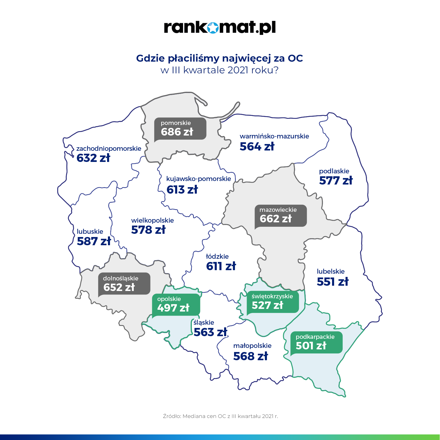 Kierowcy z województwa podlaskiego w III kwartale 2021 roku płacili za OC średnio 577 zł. W województwie śląskim, gdzie jest najmniejszy odsetek aut z silnikami o większej pojemności, kierowcy przeznaczali na OC o 14 zł mniej (563 zł).
