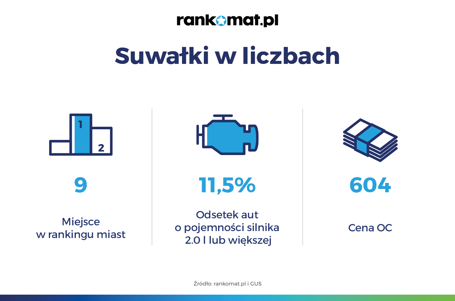 11,5 procent samochodów osobowych zarejestrowanych w Suwałkach jest wyposażonych w silnik o pojemności 2,0 l lub większej. Ten wynik w skali kraju daje miastu miejsce w pierwszej części zestawienia.