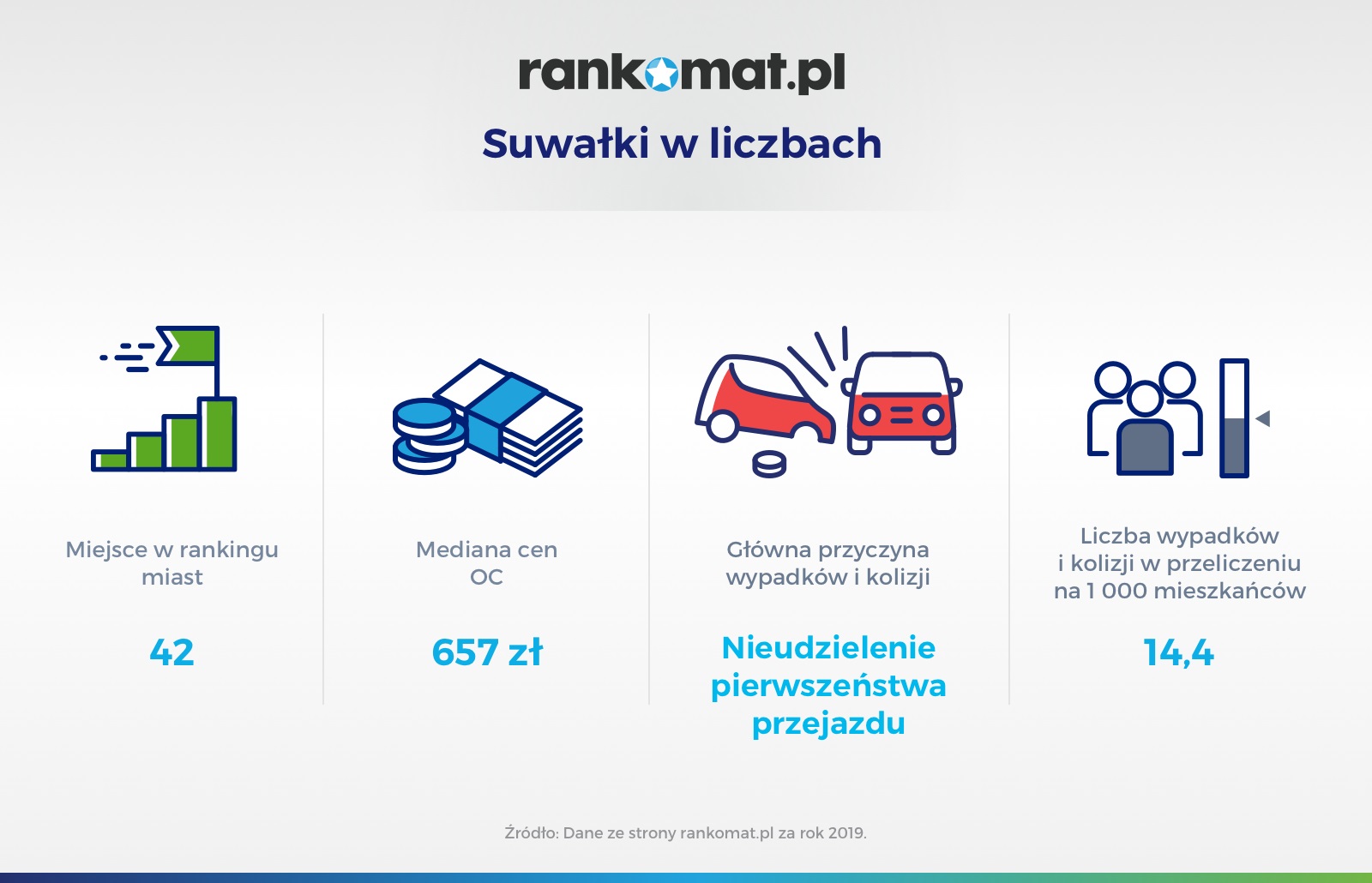 Eksperci rankomat.pl przygotowali listę 84. największych miast w Polsce i porównali, ile kolizji oraz wypadków przypada w nich na 1000 mieszkańców. Na 42. miejscu znalazły się Suwałki. Najgorzej w rankingu wypadły Katowice, najlepiej natomiast Kędzierzyn-Koźle. Do przygotowania zestawienia wykorzystano dane z Systemu Ewidencji Wypadków i Kolizji (sewik.pl).
