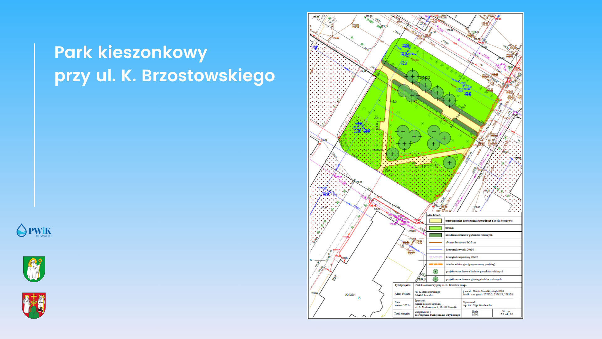 Przedmiotem zamówienia jest opracowanie dokumentacji projektowej i zagospodarowanie terenu poprzez budowÄ™ parku kieszonkowego przy ul. Karola Brzostowskiego w SuwaÅ‚kach, w formule zaprojektuj i wybuduj.