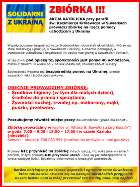 - WspóÅ‚pracujemy z UkraiÅ„cami, którzy meizkaja i pracujÄ… w SuwaÅ‚kach, a obecnie pomagajÄ… grupie uchodźców - już ponad 40 osób - matki z dziećmi, a także jedna Pani w ciąży - którzy znaleźli schronienie w SuwaÅ‚kach - informujÄ… czÅ‚lonkowie Akcji Katolickiej przy Parafii Å›w. Kazimierza Królewicza. - Swoich domów i mieszkaÅ„ użyczyli im suwalczanie oraz inni UkraiÅ„cy pracujÄ…cy w SuwaÅ‚kach, starajÄ…c siÄ™ zorganizować im chociaż namiastkÄ™ domu. Jest to szczególnie ważne dla maÅ‚ych dzieci, żeby miaÅ‚y wokóÅ‚ siebie bezpieczne, domowe otoczenie.