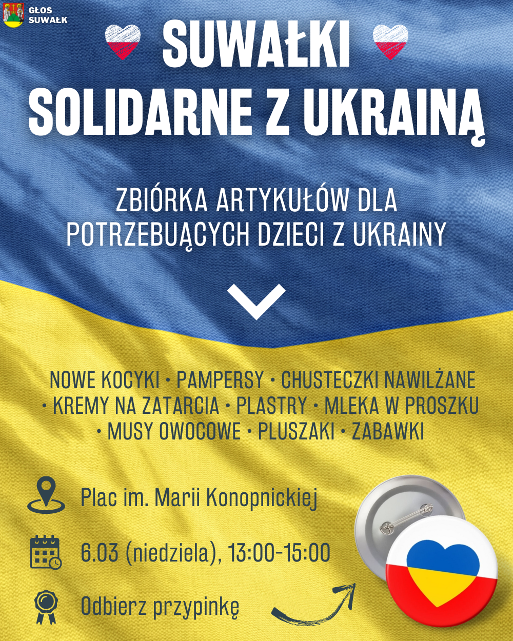 Każdy bÄ™dzie mógÅ‚ odebrać przypinkÄ™, którÄ… można przymocować do kurtki, plecaka lub torby podróżnej w geÅ›cie solidarnoÅ›ci z naszymi sÄ…siadami i protestu wobec rosyjskiej inwazji.