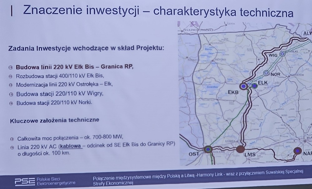 Nowa, kolejna linia ma zapewnić stabilność i synchronizację systemu Państw bałtyckich z systemem europejskim. Będzie to linia kablowa podziemna. Zacznie się w Ełku i w stronę granicy przebiegnie przez 6 gmin w tym Miasto Suwałki. Jej długość to ok 100 km. Wybudowane będą dwie stacje. Jedna z nich stanie na terenie Gminy Suwałk. Całkowita moc połączenia to 700-800 MW. Będzie to linia wysokiego napięcia 220kV.
