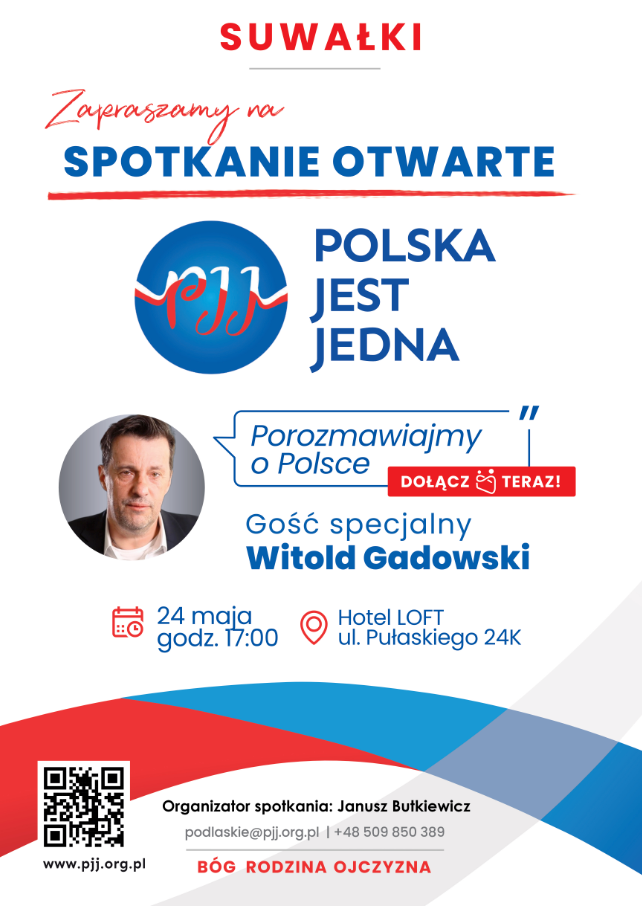 Spotkanie z Witoldem Gadowskim odbedzie sie w najbliższy piątek, 24 maja o godz. 17:00 w Hotelu Loft 1898 przy ul. Pułaskiego, a organizuje je partia Polska Jest Jedna.