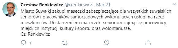 - Miasto Suwałki zakupi maseczki zabezpieczające dla wszystkich suwalskich seniorów i pracowników samorządowych wykonujących usługi na rzecz mieszkańców. Dostarczeniem maseczek seniorom zajmą się pracownicy miejskich instytucji kultury i sportu oraz wolontariusze - poinformował prezydent na Twitterze.