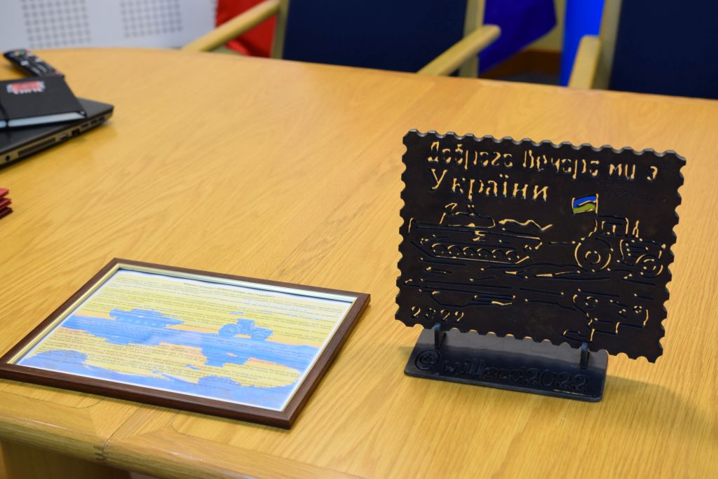 Mer Tarnopola podarowaÅ‚ też naszej delegacji wyjÄ…tkowy prezent. To znaczek pocztowy laserowo wyciÄ™ty z blachy rosyjskiego czoÅ‚gu, który UkraiÅ„cy zniszczyli pod MikoÅ‚ajewem. Na znaczku widoczny jest ukraiÅ„ski traktor ciÄ…gnÄ…cy czoÅ‚g. To jeden z symboli z poczÄ…tku wojny, kiedy to ukraiÅ„scy rolnicy dołączyli do walczÄ…cej armii z najeźdźcÄ…. To prawdopodobnie pierwszy taki symbol, który trafiÅ‚ do naszego kraju.