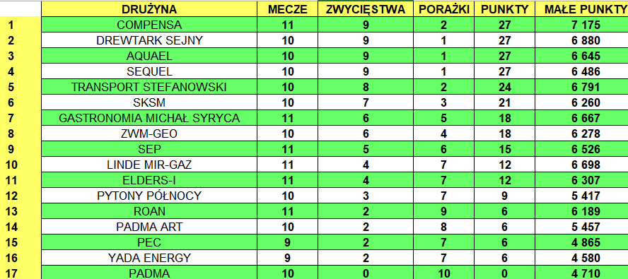 HDCP doliczany przy następnej kolejce spotkań: Yada Energy – 71 pkt., PEC – 25 pkt., Pytony Północy – 4 pkt.
