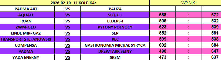 Piąty w tabeli Transport Stefanowski wygrał z PEC-em 599:538, SKSM pokonał Yadę Energy 637:473, ZWM-Geo zwyciężył Pytonów Północy 623:539, a Elders-i wygrali z ROAN-em 532:506.