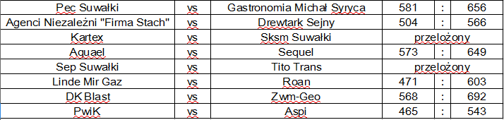 Po raz pierwszy w tej edycji Suwalskiej Ligi Bowlingowej żaden z graczy nie  uzyskaÅ‚ 200 punktów. Zawodnikiem kolejki zostaÅ‚ SÅ‚awomir Raczkowski z ZWM Geo oraz Waldemar KoÅ‚odziej z Gastronomii MichaÅ‚ Syryca – po 194 punkty. Marcin Smulko z Roan-u i Kamil SeredziÅ„ski z Sequelu rzucili po 191 punktów.