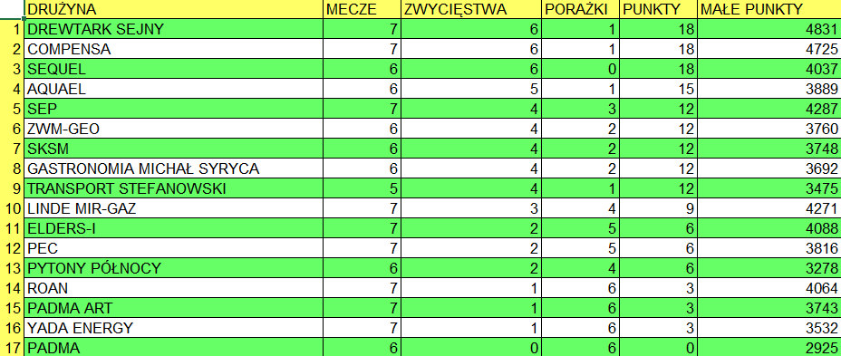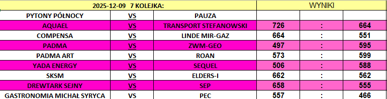 W stojącym na wysokim poziomie spotkaniu Transport Stefanowski uległ Aquelowi 664:726. Teraz jedynym niepokonanym zespołem w lidze pozostaje Sequel, który pokonał Yada Energy 588:506.