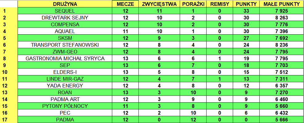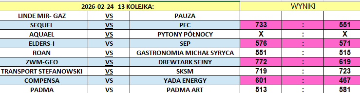 Niedawny lider, Compensa pokonała wywodzącą się z Padma Group drużynę Yada Energy 601:467, a w derbach tej firmy panowie z Padmy Art wygrali z paniami z Padmy 581:513.