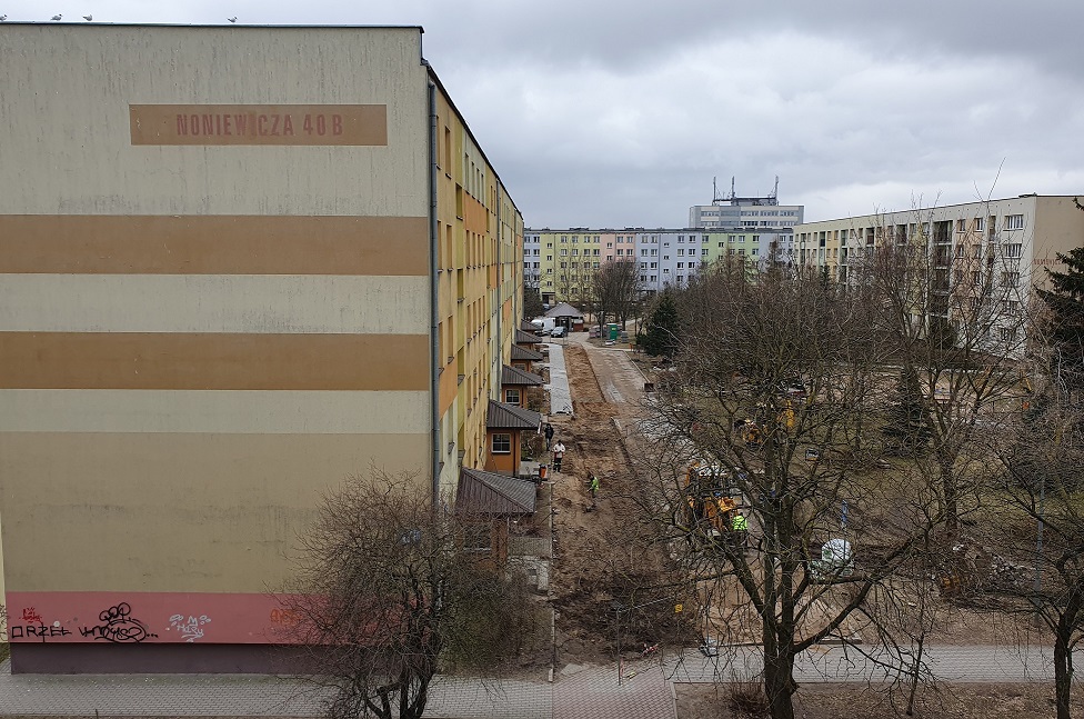 Rozpoczęły się też prace na tyłach 1 Maja, wzdłuż bloku przy ul. Noniewicza 40 B. Modernizowany jest tutaj parking na 40 miejsc oraz droga dojazdowa i chodnik, kanalizacja deszczowa i oświetlenie. Zainstalowany ma zostać monitoring