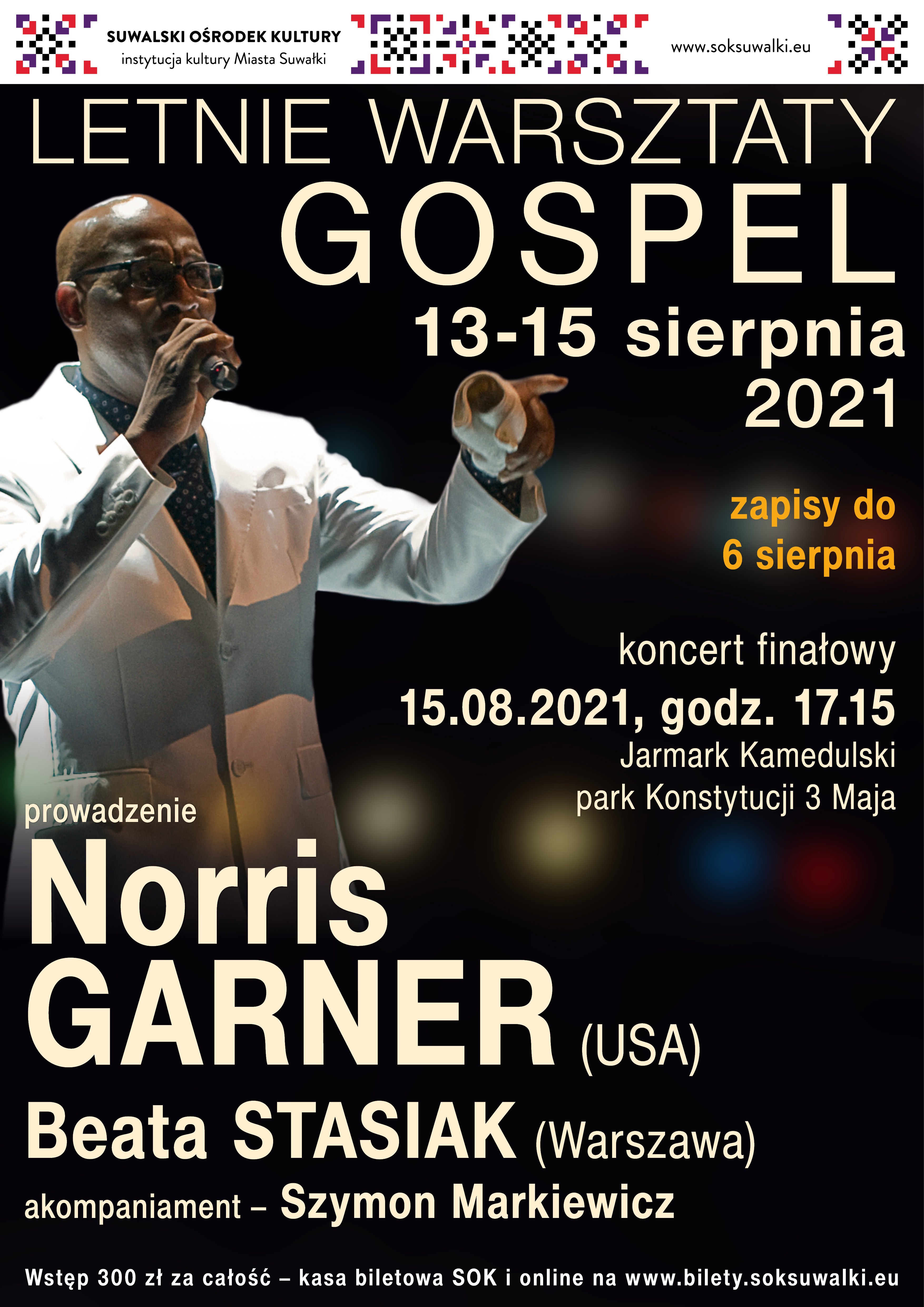 Suwalski Ośrodek Kultury zaprasza na spotkanie ze znakomitymi artystami gospel i wspólny, energetyczny występ na scenie. Warsztaty gospel poprowadzą cenione postaci muzyki gospel - uczestnicy zajęć będą szlifować swe wokalne zdolności pod okiem Norrisa Garnera, wokalisty, kompozytora i aranżera z USA oraz Beaty Stasiak, cenionej artystki prowadzącej warsztaty wokalne oraz warsztaty gospel w całej Polsce. Wokalistom i uczestnikom warsztatów akompaniować będzie pianista, kompozytor i dyrygent – Szymon Markiewicz.