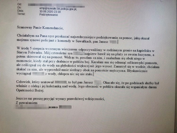 - Sierżant sztabowy Janusz Uryn po nocnej służbie odpoczywał z córeczką i jej koleżanką nad jeziorem. Siedział na pomoście i opiekował się dziewczynkami. Funkcjonariusz zauważył na pomoście małego chłopczyka, za którym szła kobieta. W pewnym momencie policjant usłyszał krzyk kobiety i zauważył, że dziecko wpadło do wody. Jak podkreśla - działał instynktownie. Błyskawicznie wskoczył w do wody i wyciągnął z niej chłopczyka, który cały się zanurzył. Całe szczęście pomoc przyszła w samą porę. Funkcjonariusz uratował dziecko. Cały i zdrowy czterolatek trafił pod opiekę wystraszonej mamy - informuje suwalska Policja.