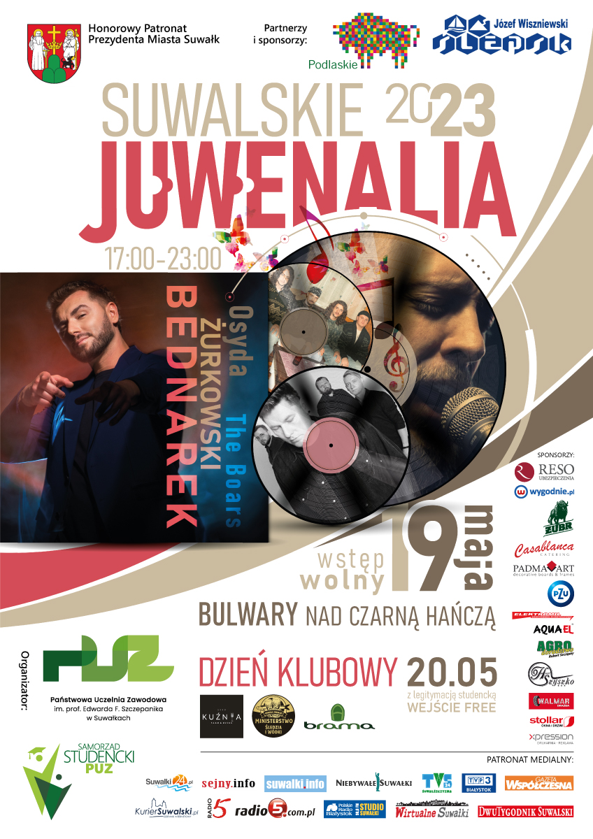 W tym roku areną Suwalskich Juwenaliów będą położone bardzo blisko stadionu bulwary nad Czarną Hańczą, a królować będzie na nich muzyka rockowa w wykonaniu wywodzących się z naszego regionu, ale robiących ogólnopolskie kariery zespołów The Boars, Osyda oraz Żurkowski, a także muzyka reggae.