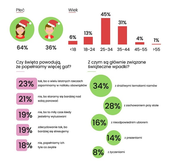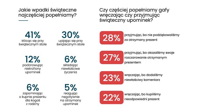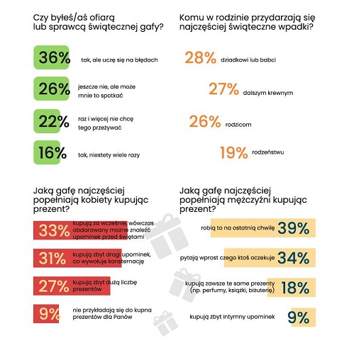 Jak wynika z badania „ÅšwiÄ…teczne gafy Polaków" zrealizowanego przez serwis PrezentmarzeÅ„ na próbie 985 respondentów Å›wiÄ…teczne wpadki zwiÄ…zane sÄ… gÅ‚ównie z drażliwymi tematami rozmów (34%), z zachowaniem przy Å›wiÄ…tecznym stole (28%) oraz prezentami (14%). Najczęściej atmosferÄ™ Å›wiÄ…t psuje kÅ‚ótnia przy Å›wiÄ…tecznym stole jak potwierdziÅ‚o, aż 49% respondentów lub też co gorsza gdy siÄ™ upijamy – 32% odpowiedzi. Powodem niesnasek jest również podarowanie nietrafionego upominku jak twierdzi 12% osób. Podczas Å›wiÄ…t ogólnie popeÅ‚niamy wiele gaf ponieważ zapominamy o wielu istotnych rzeczach podczas natÅ‚oku obowiÄ…zków (28%) i bardziej siÄ™ stresujemy (19%). Wielu z nas byÅ‚o również sprawcÄ… lub ofiarÄ… Å›wiÄ…tecznej gafy, ale co trzeci Polak potwierdza, że uczy siÄ™ na błędach i nie popeÅ‚nia już tych samych wpadek. Naprawić Å›wiÄ…teczna gafÄ™ można przeprosinami (64%) jednak trudno jÄ… naprawić od razu i należy też poczekać na kolejne Å›wiÄ™ta (29%).