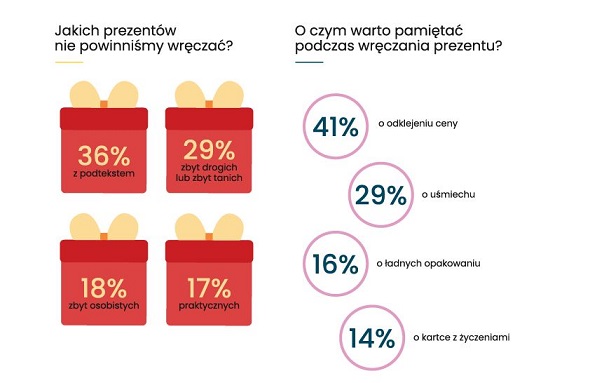Najczęściej gafy popełniamy wręczając prezent, kiedy kupiliśmy nieodpowiedni upominek (22%) lub dodaliśmy do niego niewłaściwy komentarz (23%). Kiedy przyjmujemy prezent nietaktem jest okazanie rozczarowania otrzymanym podarunkiem (27%) oraz niepodziękowanie za prezent (28%). Podczas wręczania prezentu warto pamiętać o odklejeniu ceny (41%), o uśmiechu (29%), ładnym opakowaniu (16%) oraz o kartce z życzeniami (14%). Kiedy otrzymamy nietrafiony prezent nie wypada okazywać niezadowolenia (28%) i nie wolno oddawać takiego upominku (9%). Należy uśmiechnąć się i podziękować (37%) oraz docenić starania (26%).