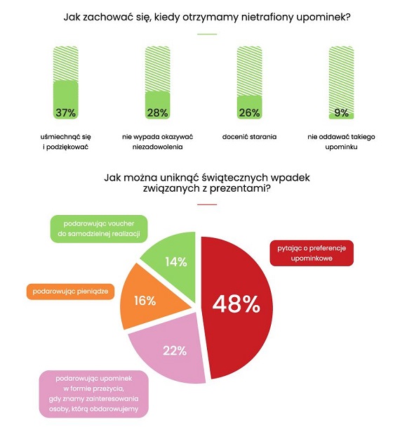 Aby uniknąć Å›wiÄ…tecznych wpadek prezentowych należy zapytać o preferencje upominkowe (48%) lub podarować upominek w formie przeżycia, gdy znamy zainteresowania osoby, którÄ… obdarowujemy (22%). Można również podarować voucher do samodzielnej realizacji (14%) lub po prostu podarować pieniÄ…dze, jak uważa 16% ankietowanych. NielubianÄ… gafÄ… jest również kupowanie zawsze tych samych prezentów jak na przykÅ‚ad perfum, książek lub biżuterii (18%). Respondenci uważajÄ… również, że nie powinno siÄ™ wrÄ™czać prezentów z podtekstem (36%), zbyt drogich lub zbyt tanich (29%), zbyt osobistych (18%) i praktycznych (17%).