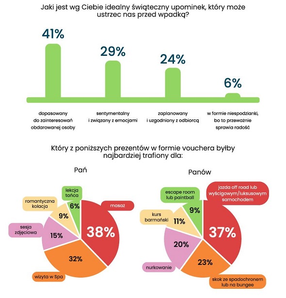 Jak wynika z badania serwisu PrezentmarzeÅ„ idealny upominek, który nas może ustrzec przed wpadkÄ… to dostosowany do zainteresowaÅ„ obdarowanej osoby (41%) lub zaplanowany i uzgodniony z odbiorcÄ… (24%). Mile widziane sÄ… również prezenty sentymentalne i zwiÄ…zane z emocjami (29%). WedÅ‚ug respondentek najbardziej trafionym prezentem dla PaÅ„ byÅ‚by masaż (32%) lub wizyta w SPA (32%). Mile widziana jest również sesja zdjÄ™ciowa (15%), romantyczna kolacja (9%) lub lekcja taÅ„ca (6%). Panowie jednak wolÄ… prezenty z wiÄ™kszÄ… dawka emocji jak na przykÅ‚ad jazda off road lub wyÅ›cigowym/luksusowym samochodem (37%), skok ze spadochronem lub na bungee (23%) czy nurkowanie (20%). Na liÅ›cie pojawiÅ‚ siÄ™ również kurs barmaÅ„ski (11%) czy escape room lub paintball (9%).