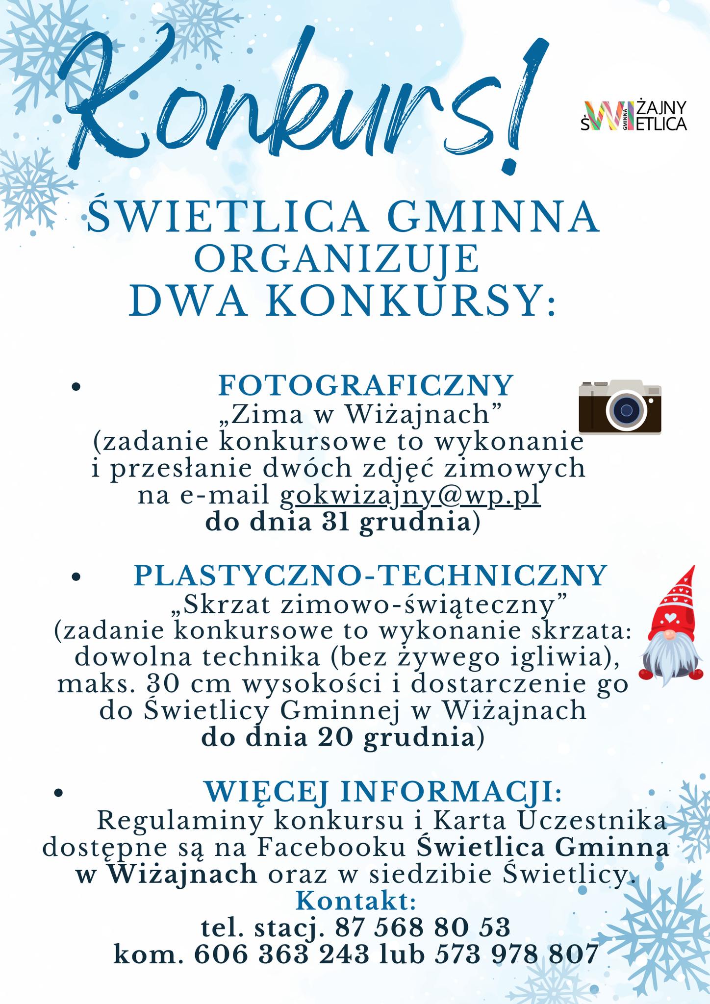 - Chwytajcie zimowe kadry, bo zadaniem konkursowym jest wykonanie i przesłanie na e-mail: gokwizajny@wp.pl DWÓCH ZDJĘĆ o tematyce zimowej lub/i świątecznej do 31 grudnia 2024 r. - zachęca do udziału Świetlica.