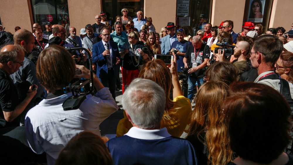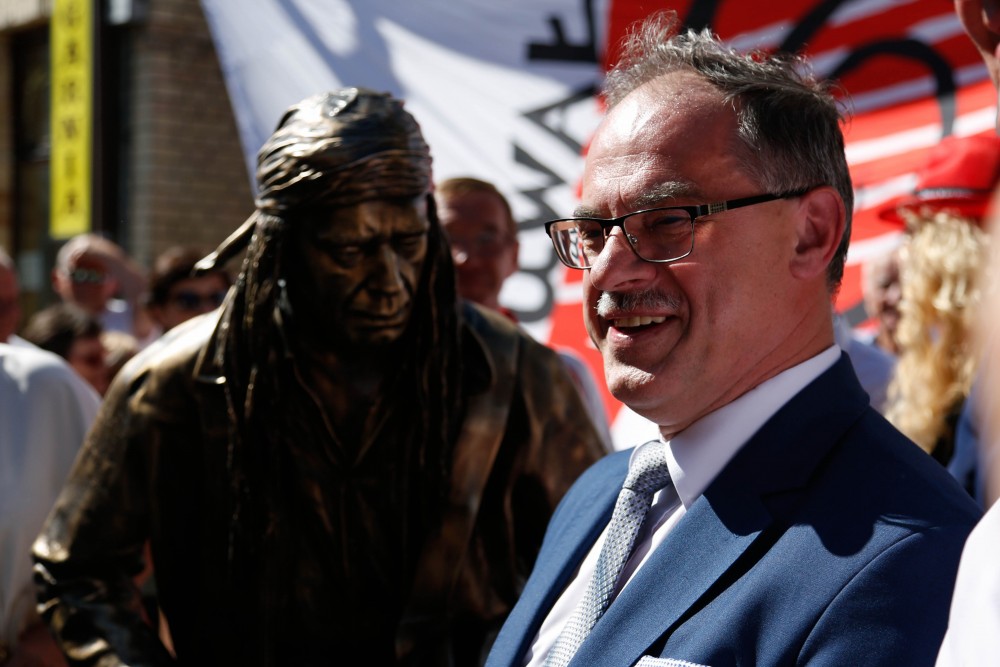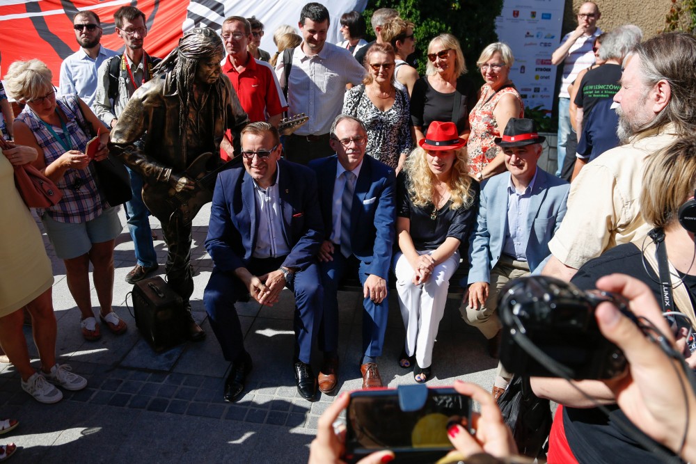 Ławeczkę odsłonili Czesław Renkiewicz- prezydent Suwałk oraz autor rzeźby Janusz Tałuć.