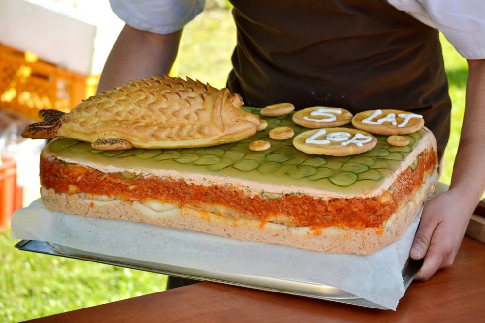 Na fot.: tak prezentował się tort rybny, przygotowany na 5-lecie LGR „Pojezierze Suwalsko-Augustowskie"