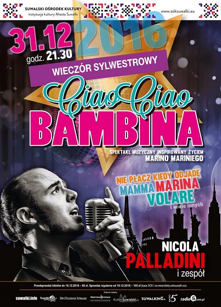 W ostatni wieczór 2016 roku zapraszamy na muzyczny spektakl inspirowany życiem Marino Mariniego – ambasadora włoskiej piosenki w Polsce. Odwiedzimy nowojorską Małą Italię, kabarety Neapolu i Rzymu, paryską Olimpię i Polskę, która śpiewała z artystą piękną balladę „Nie płacz, kiedy odjadę”. Na scenie „italiano vero” – Nicola Palladini oraz muzyka na żywo!