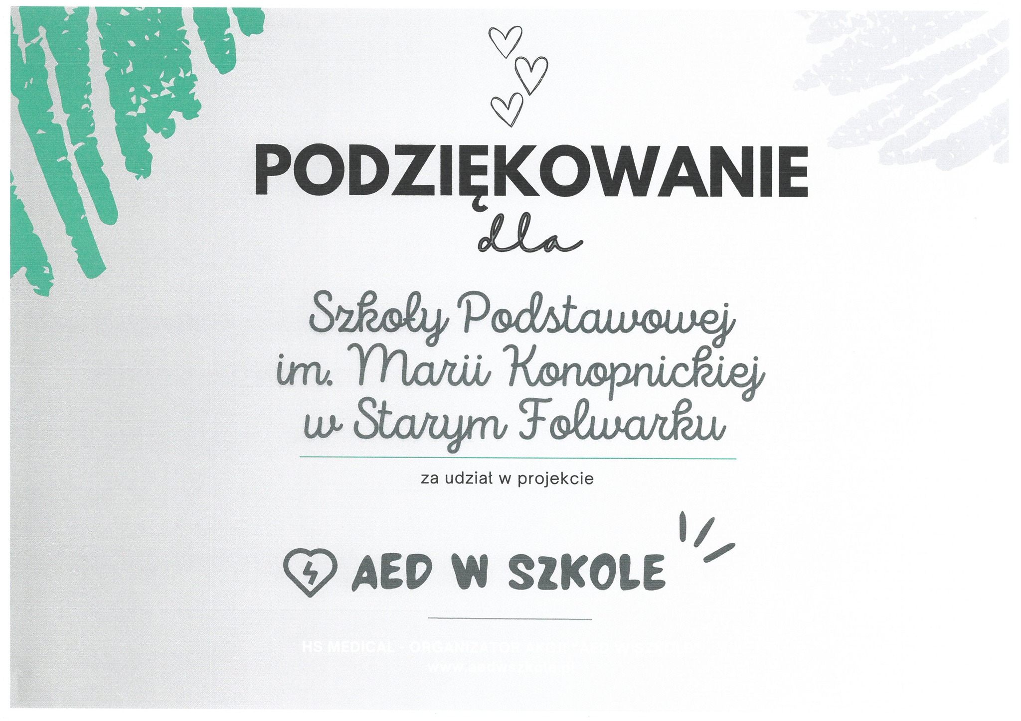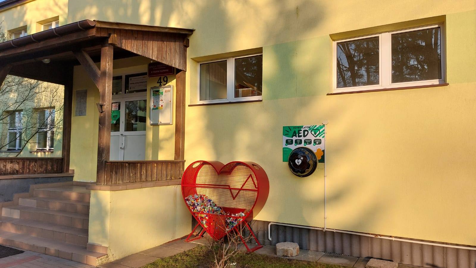 Defibrylator AED wisi już na ścianie przy głównym wejściu do Szkoły Podstawowej im. Marii Konopnickiej w Starym Folwarku.