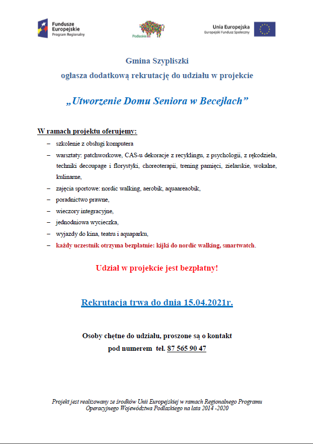 Gmina Szypliszki ogłasza dodatkową rekrutację do udziału w projekcie "Utworzenie Domu Seniora w Becejłach".