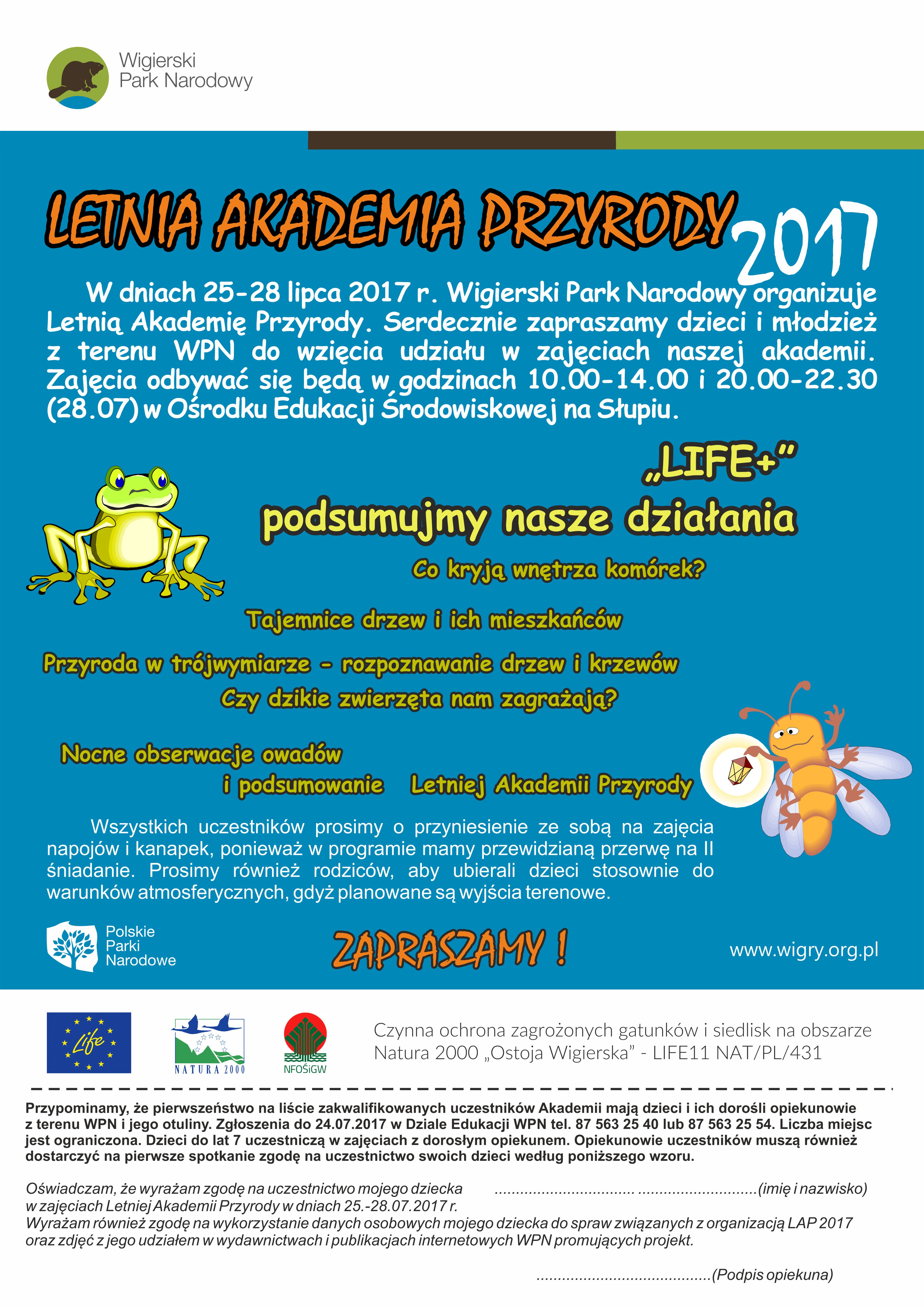 Na Letnią Akademię Przyrody zaprasza w dniach 25-28 lipca do Ośrodka Edukacji Środowiskowej na Słupiu Wigierski Park Narodowy. Zajęcia będą odbywać się w godzinach 10.00-14.00,a 28 lipca w godzinach 20.00-22.30.