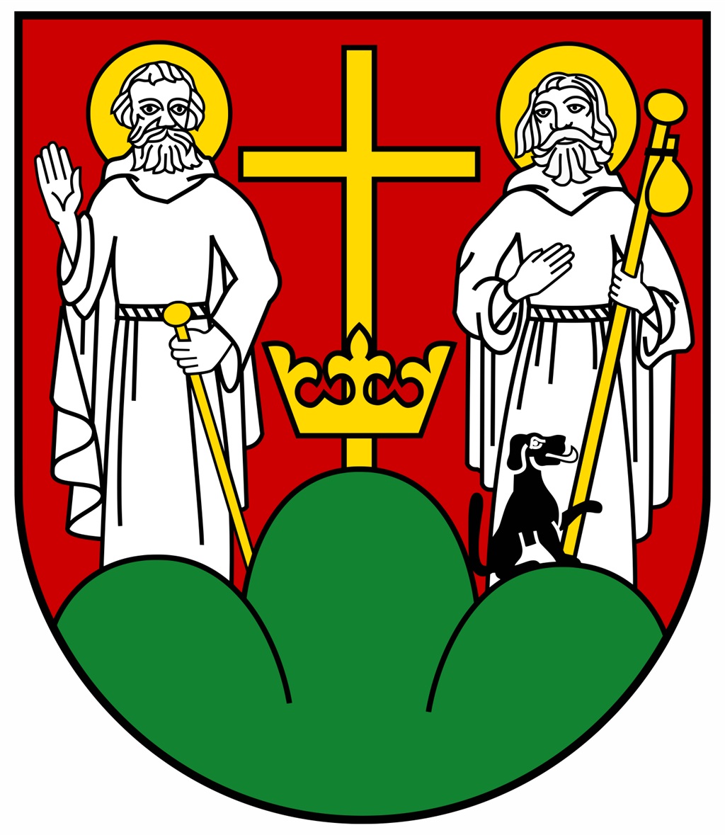 Opis heraldyczny nowego wizerunku herbu brzmi nastÄ™pujÄ…co: „W polu czerwonym na trójwzgórzu zielonym krzyż Å‚aciÅ„ski zÅ‚oty, z naÅ‚ożonÄ… na dolne ramiÄ™ takąż koronÄ… o trzech widocznych kwiatonach i dwóch widocznych perÅ‚ach, majÄ…cy z prawej postać Å›w. Romualda stojÄ…cego na wprost, z nimbem zÅ‚otym, z dÅ‚ugÄ… rozwidlonÄ… brodÄ… srebrnÄ…, w takimż habicie kamedulskim srebrnym, prawicÄ™ unoszÄ…cego w geÅ›cie bÅ‚ogosÅ‚awieÅ„stwa, lewicÄ™ wspierajÄ…cego na lasce zÅ‚otej, trzymanej przed sobÄ…, w skos; z lewej postać Å›w. Rocha kroczÄ…cego w prawo, z nimbem zÅ‚otym, z krótkÄ… brodÄ… i wÅ‚osami srebrnymi, w takiejż tunice do kolan, przewiÄ…zanej takimż sznurem, z takąż pelerynkÄ… z kapturem, w takichż butach z krótkÄ… cholewkÄ…, trzymajÄ…cego prawicÄ™ na piersi, zaÅ› lewicÄ™ wspierajÄ…cego na dÅ‚ugiej lasce podróżnej zÅ‚otej z takąż tykwÄ…, w skos lewy, trzymanej przed sobÄ…; u jego stóp pies czarny kroczÄ…cy w lewo, patrzÄ…cy w prawy skos, trzymajÄ…cy w pysku chleb zÅ‚oty”.
