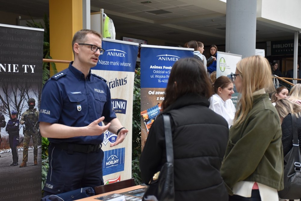 Gości dzisiaj u nas kilkudziesięciu pracodawców, do tego instytucje edukacyjne oraz firmy związane ze szkoleniami – opowiadał Dawid Harasim, rzecznik Państwowej Uczelni Zawodowej. - Do tego oczywiście oferta Państwowej Uczelni Zawodowej w Suwałkach, więc chcieliśmy połączyć wszystko, żeby każdy mógł znaleźć coś dla siebie — zarówno osoby chcące się dokształcać, jak i osoby poszukujące pracy. Wiem, że na niektórych stanowiskach dzisiaj firmy mogą nawet przyjmować pierwsze dokumenty aplikacyjne.