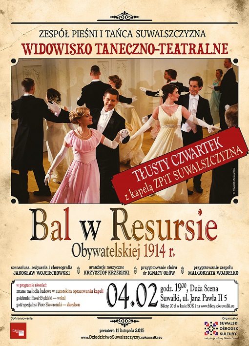 Tłusty czwartek na balu? Czemu nie! Zapraszamy do udziału w konkursie, w którym do wygrania są dwa bilety na widowisko „Bal w Resursie Obywatelskiej 1914”. Muzyczny spektakl będzie można obejrzeć jutro na wielkiej scenie Suwalskiego Ośrodka Kultury.