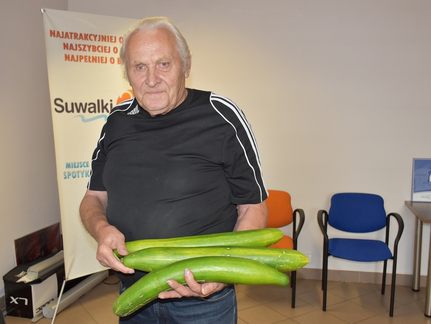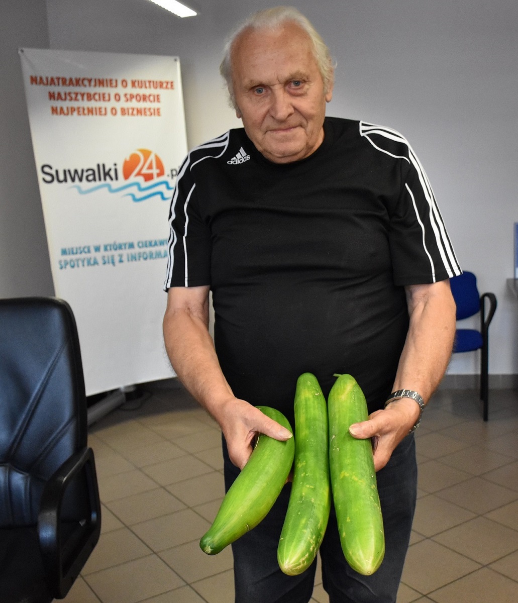 Suwalskie redakcje, w tym naszą, z dumą odwiedzał dzisiaj Ireneusz Jankowski. Miał się kim i czym pochwalić. Razem z wnukiem, 19-letnim Tomaszem Jankowskim, uczniem technikum ogrodniczego w Suwałkach na działce w Osowej wyhodowali, bez żadnego nawożenia, ogórki niecodziennej wielkości.