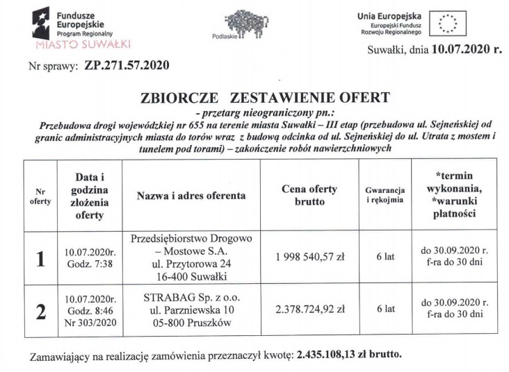 Przebudowa ulicy Sejneńskiej od granic administracyjnych miasta do torów wraz z budową odcinka od ul. Sejneńskiej do ul. Utrata z mostem i tunelem pod torami) – zakończenie robót nawierzchniowych.