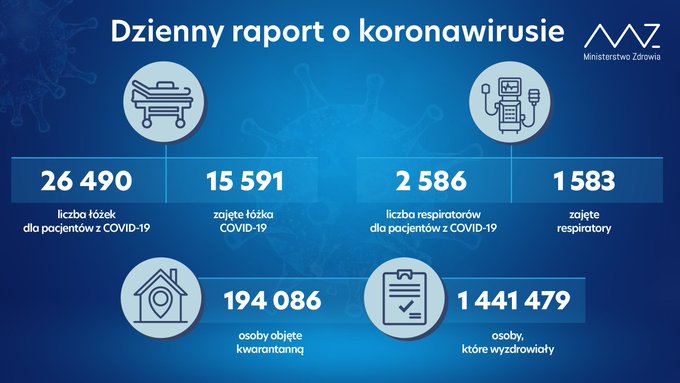 Ministerstwo Zdrowia poinfomowało o 15 698 nowych i potwierdzonych przypadków zakażenia koronawirusem z województw: mazowieckiego (2750), śląskiego (1989), pomorskiego (1399), małopolskiego (1272), wielkopolskiego (1212), warmińsko-mazurskiego (1132), łódzkiego (960), kujawsko-pomorskiego (949), dolnośląskiego (782), podkarpackiego (687), zachodniopomorskiego (605), lubelskiego (500), podlaskiego (461), lubuskiego (387), świętokrzyskiego (274), opolskiego (208).