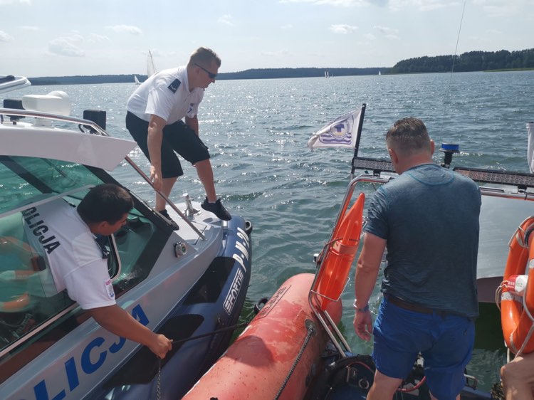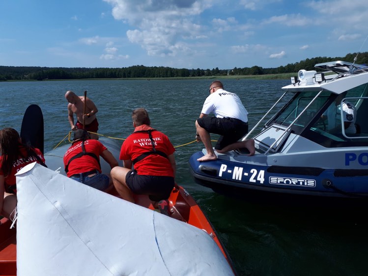 Chwilę później okazało się, że kolejne osoby potrzebują pomocy. Mundurowi wspólnie z ratownikami suwalskiego WOPR-u znowu ruszyli z pomocą załodze żaglówki, która wywróciła się niedaleko plaży Polskiego Towarzystwa Turystyki Krajobrazowej w Starym Folwarku. Na miejscu byli już inni ratownicy suwalskiego WOPR-u, którzy wyciągnęli z wody dwie kobiety. W jeziorze pływało jeszcze dwóch mężczyzn, którym pomógł patrol z policyjnej łodzi. W tym przypadku cała czwórka suwalczan miała na sobie kamizelki asekuracyjne. Policjanci z ratownikami przywiązali żaglówkę do łodzi motorowych i ją postawili. Również i w tym przypadku załoga bezpiecznie trafiła na brzeg.