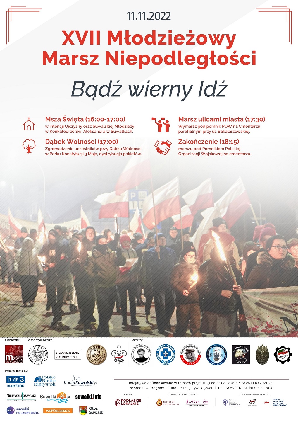 Marsz odbędzie się 11 listopada 2022 r. w Suwałkach już po raz siedemnasty - tym razem pod hasłem: "Bądź wierny Idź!". Młodzieżowy Marsz Niepodległości stanowi wyraz szacunku do historii i Ojczyzny oraz służy kształtowaniu i pielęgnowaniu wartości szeroko pojętego patriotyzmu.