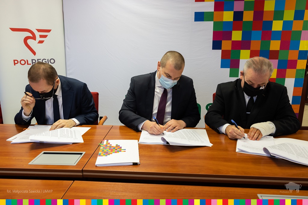 UmowÄ™ podpisaÅ‚ Marek OlbryÅ›, wicemarszaÅ‚ek Województwa Podlaskiego, Artur Martyniuk, prezes POLREGIO oraz Adam Pawlik, dyrektor handlowy SpóÅ‚ki.