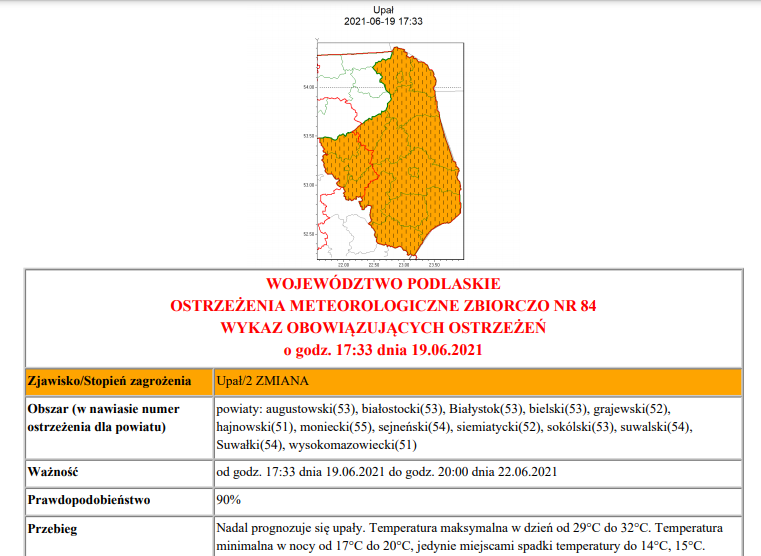 Białostockie biuro prognoz IMGW-PIB przedłużyło ostrzeżenie o upałach do najbliższego wtorku, 22 czerwca. Temperatura w cieniu od 29°C do 32°C. Mamy ciepłe noce: od 17°C do 20°C, jedynie miejscami mogą wystąpić spadki temperatury do 14°C - 15°C.