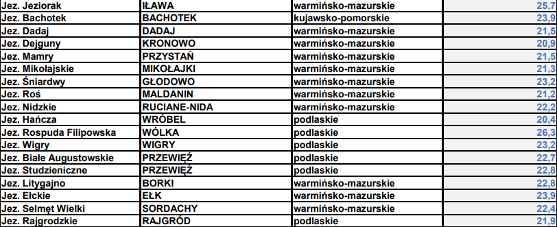 Temperatura wody w jeziorach naszego regionu (IMGW-PIB):