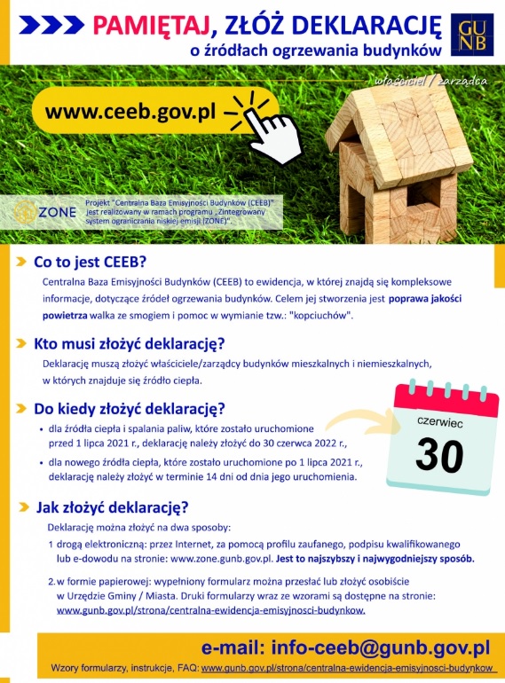 Przypominamy, że od 1 lipca 2021 r. właściciele i zarządcy budynków mają obowiązek zgłoszenia źródła ogrzewania do Centralnej Ewidencji Emisyjności Budynków (CEEB). Deklaracje, można składać online na stronie: https://ceeb.gov.pl/ Link otwiera się w nowym oknie lub w wersji papierowej, za pośrednictwem urzędu gminy.