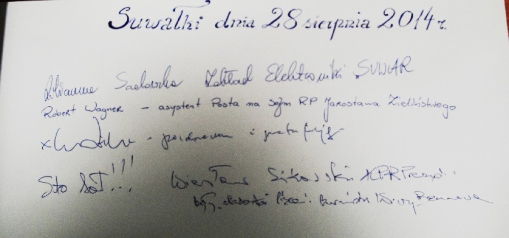 - Polska potrzebuje aktywnych obywateli i dobrych gospodarzy w samorzÄ…dach. Polska potrzebuje ludzi kochajÄ…cych swoje „MaÅ‚e Ojczyzny” - mówiÅ‚ W. Sikorski. – SwojÄ… drogÄ…, jako byÅ‚y samorzÄ…dowiec (w latach 90-tych starosta piski – dop. wÅ‚.), pierwszy raz widzÄ™ gabinet, w którym pracujÄ…cego wójta można podglÄ…dać przystawiajÄ…c nos do szyby - żartowaÅ‚. Minister Sikorski przekazaÅ‚ wójtowi list od Prezydenta RP BronisÅ‚awa Komorowskiego, a po części oficjalnej wpisaÅ‚ siÄ™ do KsiÄ™gi PamiÄ…tkowej UrzÄ™du Gminy SuwaÅ‚ki.