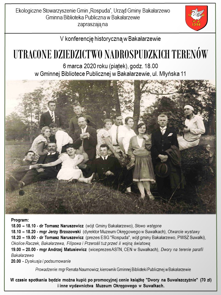 Ekologiczne Stowarzyszenie Gmin "Rospuda", Urząd Gminy Bakałarzewo i Gminna Biblioteka Publiczna w Bakałarzewie zapraszają na V konferencję historyczną pod tytułem: " Utracone dziedzictwo Nadrospudzkich terenów".