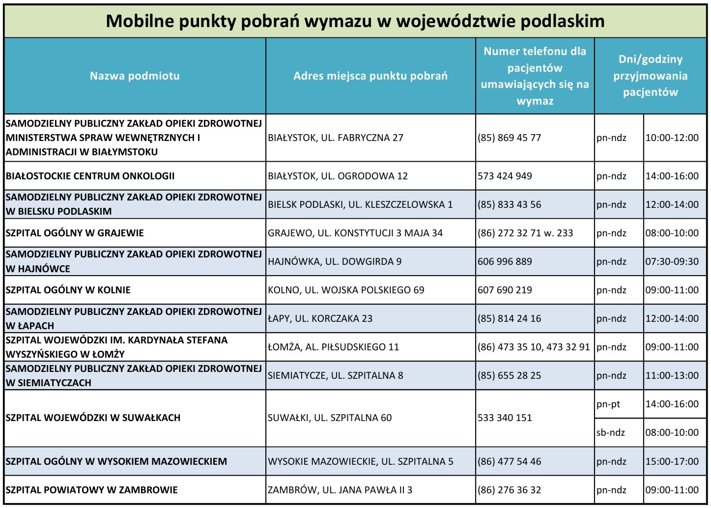 Szczegółowe informacje oraz adresy punktów pobrań, w których można wykonać test, dostępne są na stronie Podlaskiego NFZ https://www.nfz-bialystok.pl/aktualnosci-oddzialu/uzdrowiska-wznawiaja-swoja-dzialalnosc/