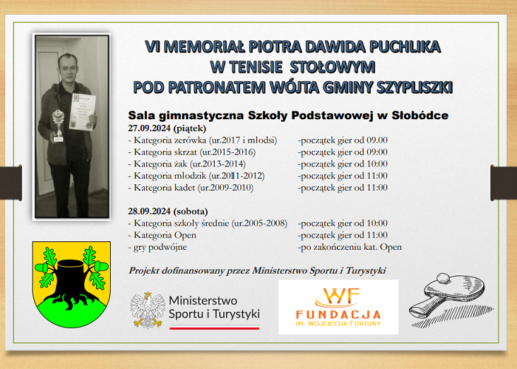 Fundacja im. Wojciecha Fortuny, Urząd Gminy Szypliszki oraz Szkoła Podstawowa w Słobódce serdecznie zapraszają do udziału w VI Memoriale Piotra Dawida Puchlika w Tenisie Stołowym pod Patronatem Wójta Gminy Szypliszki.